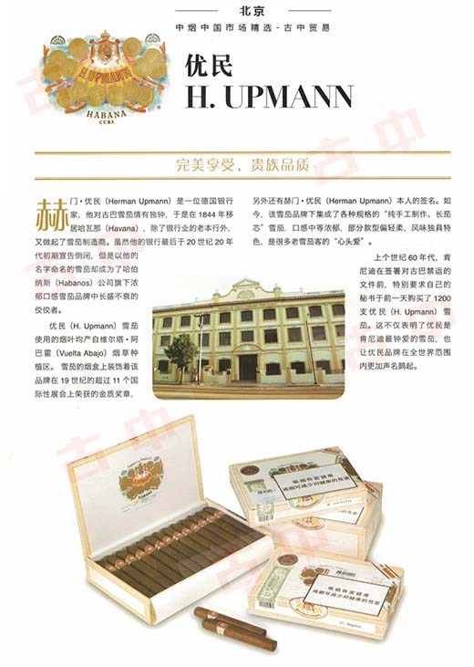 在世界上著名品牌的雪茄,H.Upmann品牌,是从Herman Upmann(德国银行家)在1844年使用特别被印的雪茄盒为增进他的银行项目。这个计划很成功、因此H.Upmann品牌继续到今天。 这个品牌很成功,因为从1862年到1893年之间陈列七国际的七枚金牌;今天这些奖仍然装在石印箱子的内部。这个品牌在1922年卖给英国的企业J. Frankau,最后在1935年被卖给了Menendez、Garcia & Cia。古巴在国有化之前。今天继续在H.Upmann 工厂,现在以Jose Marti 著名。
