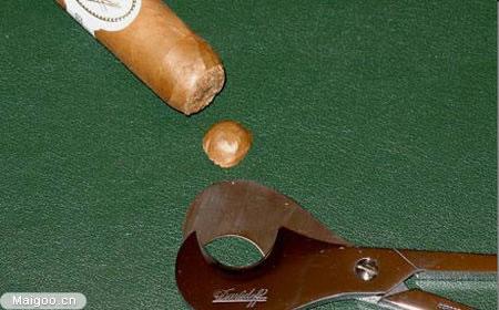 一刀切掉雪茄帽,切雪茄头时应尺寸适当,但不要将整个密封端头切去,否则外包叶便会松脱,裁口的大小因人而异,喜欢大口大口吸的人可以裁大些。