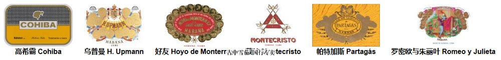 - 国际品牌(全球供货): 高希霸 Cohiba,乌普曼 H. Upmann,好友 Hoyo de Monterrey,荷西比雅达 Jose L. Piedra,蒙特 Montecristo,帕特加斯 Partagas和 罗密欧·朱丽叶Romeo y Julieta。