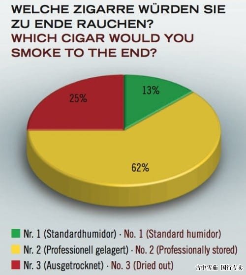百分之六十二的人猜对了,没有。2是正确储存的雪茄。令人惊讶的是,更多的参与者(24%)更喜欢 1 号雪茄。3号雪茄,已完全干燥,雪茄号为1,储存在波动湿度(13%)下。