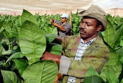 每年2~3月是古巴烟叶收成的时节。雪茄烟叶的采摘不同于普通烤烟,不用比及叶面微黄,当然,也不行过早,通常比及九老练便可采摘。采摘时通常三四片烟叶为一束,用草皮捆扎,在地边晾棚中风干。古巴的海洋性气候使空气中带有一些盐分,湿度较大,烟叶不易破碎。图为坐落哈瓦那的一片烟田,烟农在采摘烟叶。