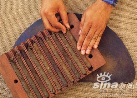 手拿撕好的填料叶,木板上放的是绑缚叶。这只是一个开始的姿态,如今卷制好的是雪茄的内部,还对比松懈,还需求放在一个特制的模版里,把它限制成型。模版是一种特别资料制成,里边能够放十只巨细一样的雪茄。