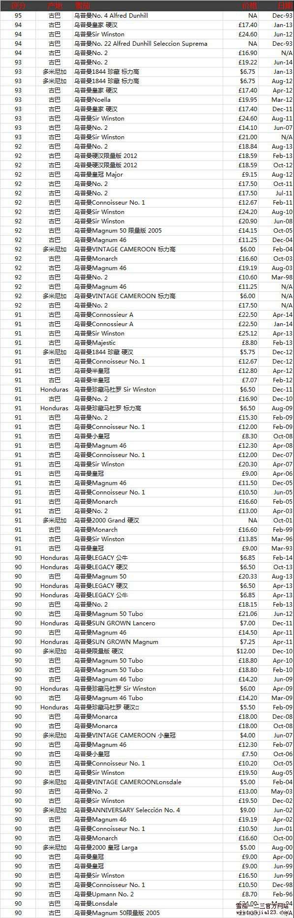 乌普曼雪茄(官方网站)历年评分1994-2014