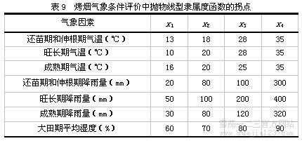 依据前边说到的烤烟气候评估条件,关于烤烟而言,大田期日照时数适合于S型从属度函数曲线,x1、x2别离为400小时、600小时;气温、降雨量、湿度明显适用于抛物线型从属函数,其各个拐点的取值如下表:
