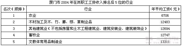 2004年在岗员工年人均薪酬最低的五个行业(倒排)为:农业,木材加工及木、竹、藤、棕、草制业品,别的建筑业(不包含房子和土木工程建筑业、建筑装置业、建筑装饰业),畜牧业,文教体育用品制造业。所有行业中仅有农业年均匀薪酬在万元以下,为6706元。